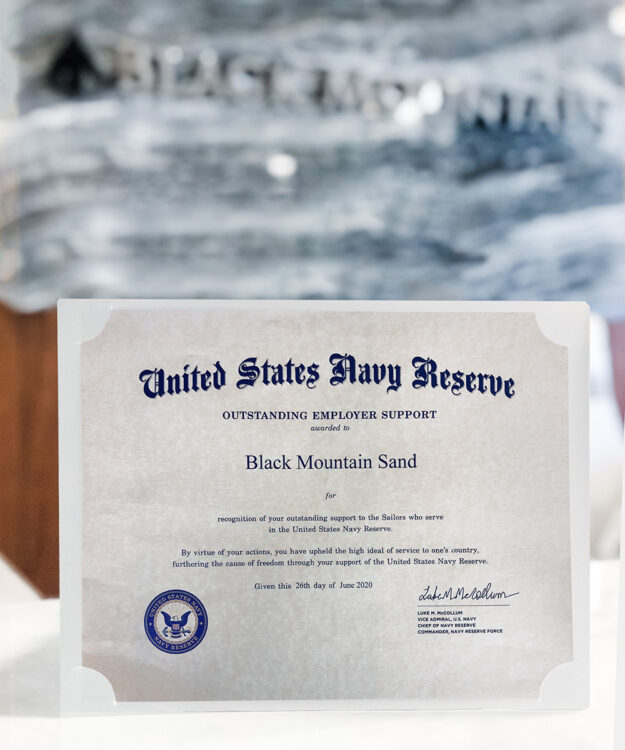Black Mountain Sand Receives U.S. Navy Reserve Outstanding Employer Support Award Jason Morin, CEO The United States Navy Reserve recently named Black Mountain Sand a recipient of its Outstanding Employer Support Award. Almost one-half of the U.S. military is comprised of the Guard and Reserve. The Department of Defense shares these citizen warriors with their…